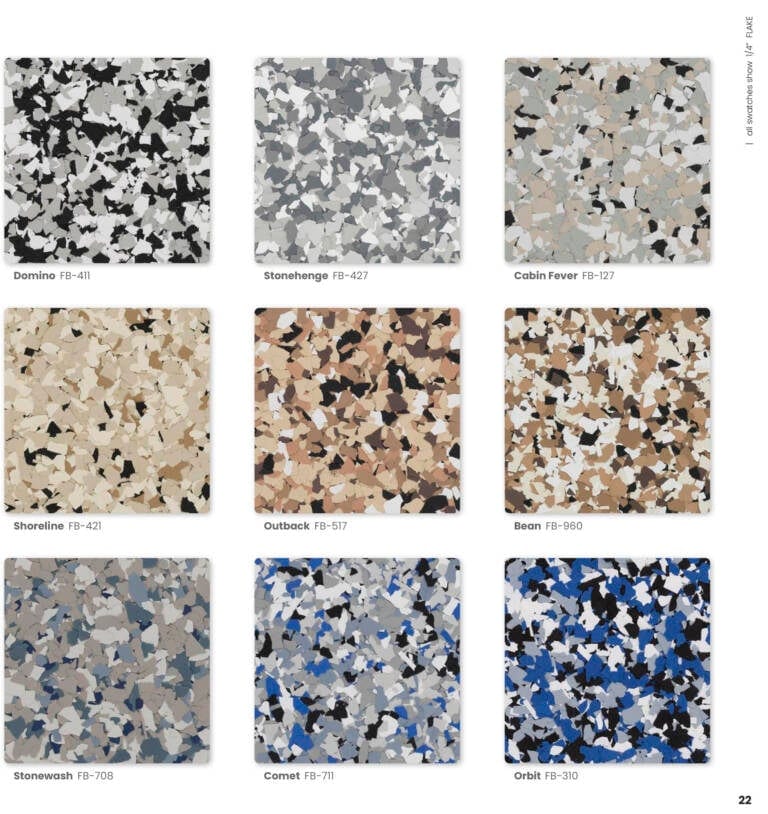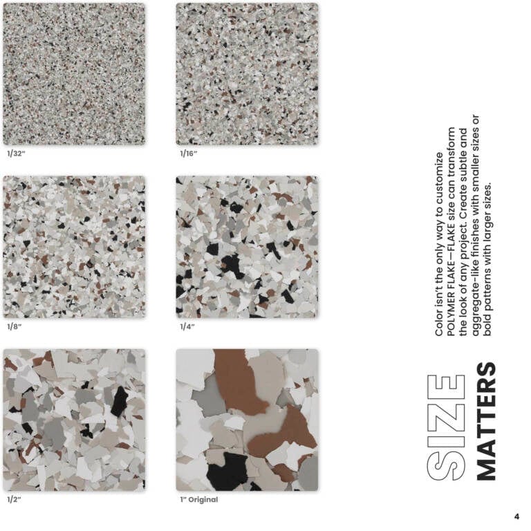 In the past, most epoxy flooring systems used 3/8” flakes in a wide-ranged color combination such as white, gray, and black. These installations are intended to mimic terrazzo and are often described as having a very commercial aesthetic