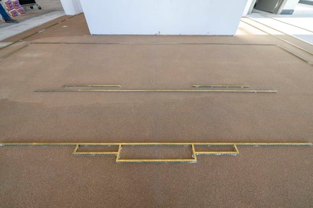 The decorative metal strip is cut with a miter saw and attached to the prepared floor according to the architect’s plans. Both concrete screws and 2-part epoxy adhesive are used to metal strip to the subfloor.