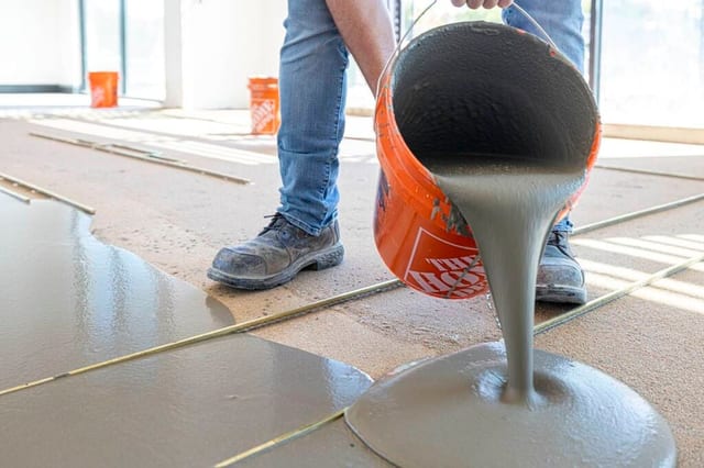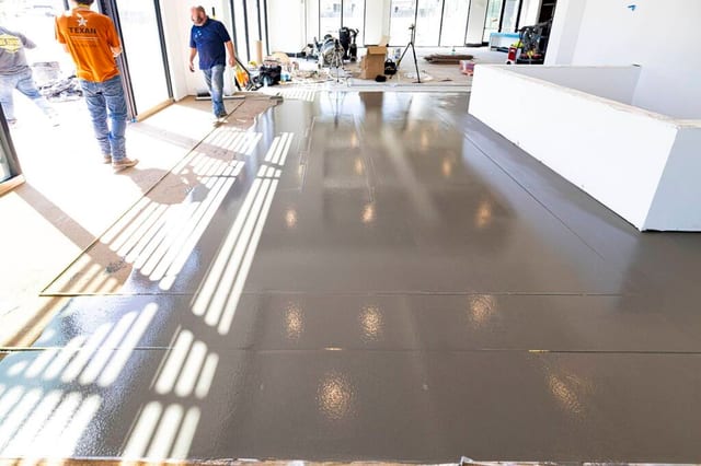 After completing the subfloor preparation and metal strip installation, concrete is poured at a consistent depth across the floor. This overlay material, Ardex 520, comes in 50lb bags and is mixed on-site using specialized concrete mixing drills. This mixing is done in small batches to provide the work time required by the installer to ensure that the overlay material is flat and of the correct depth. It is crucial that the concrete being poured is not allowed to harden before the installer has time to attend to it, so the concrete is mixed by several skilled mixing crews in approximately 40 sq. ft. batches.