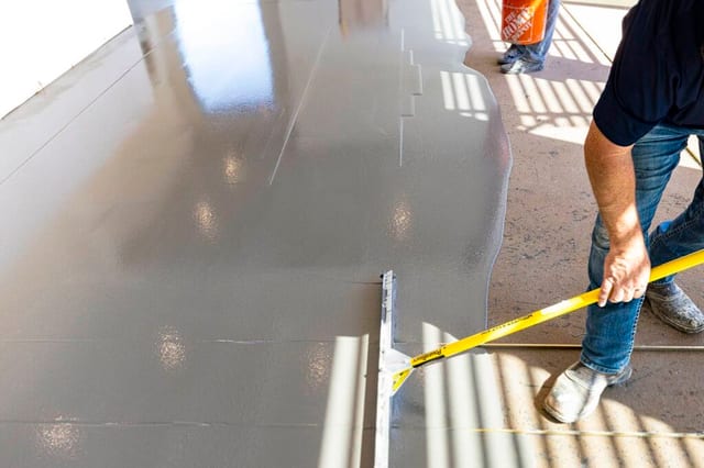 A wide rake with depth gauges is used by a skilled installer to manipulate the material after it has been poured over the prepared subfloor. Because of the extreme hardness of this concrete material, it takes less than 15 minutes for it to harden after being poured from a concrete mixer.